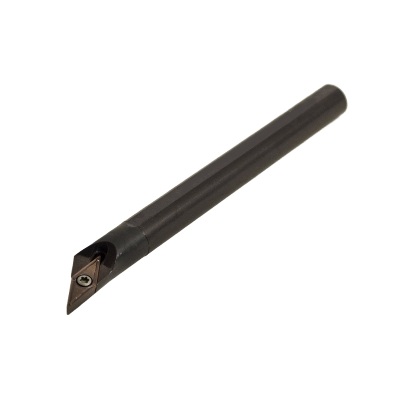 Державка токарная правая расточная, угол плане 142 градусов, для пластин V.., длина державки 180 мм, диаметр державки равен 16 мм. При изготовлении токарных державок основная мехобработка ведется после термообработки, это обеспечивает следующие преимущества: размеры и параметры постоянные и точные, более точные посадочные гнезда под пластины – дольше срок службы комплектующих и СМП, повышенная жесткость державок.